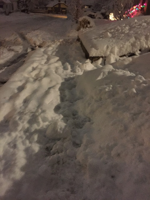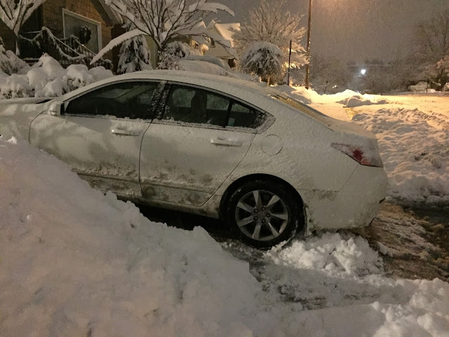 My driveway had about a foot and a half of snow. My world-record setting incredibly LONG and exceedingly narrow driveway. There was no possible way to get my car onto it and I couldn't park it anywhere else because the streets were lined with high snow banks from the many plows that came through during the day.