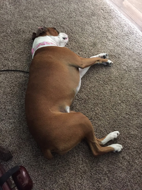 | I swear to you that Macy chased her tail for five minutes before collapsing on the floor like this. |