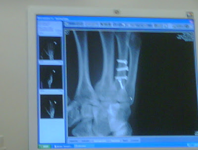 Here's a somewhat blurry X-ray of my hand. You can see the four screws going down my bone: the latest additions to my body.