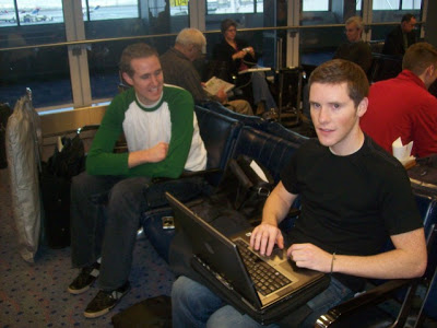 Mike and I sitting the SLC airport early in the morning after finding out our flight would be delayed as our plane blew up (or something) moments before we were supposed to take off.
