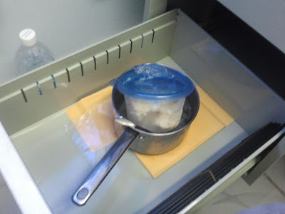 | I was sitting at my desk at work when I got a phone call from Daniel. He got me talking about a delicious fruit salad I had made the night before. Finally, I said, "I really wish I had some right now." He responded, "if you want it bad enough, I could make it appear in your office." I told him I did and he said, "poof. Check your bottom drawer." I opened it and just about fell out of my chair laughing when I saw this. Somehow he hid it in there when I wasn't around and was waiting all day to do this "magic trick" over the phone. And that my friends is what happens when you live on a tropical island with nothing to do. |
