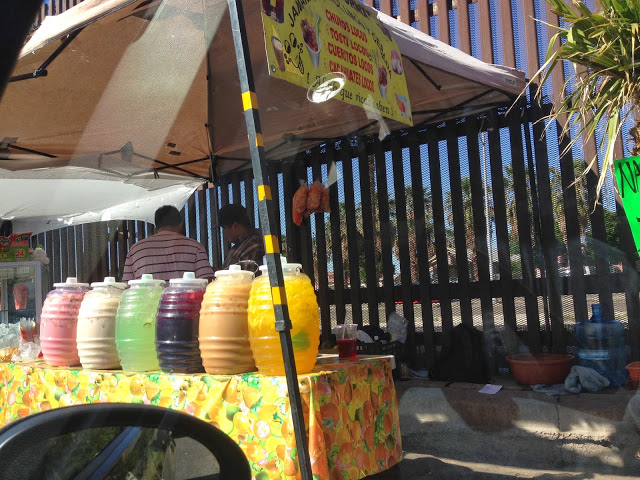 | Jugs of something at the border in Mexico. I saw a man stir the yellow one with his arm. Who does he think he is? ME? |