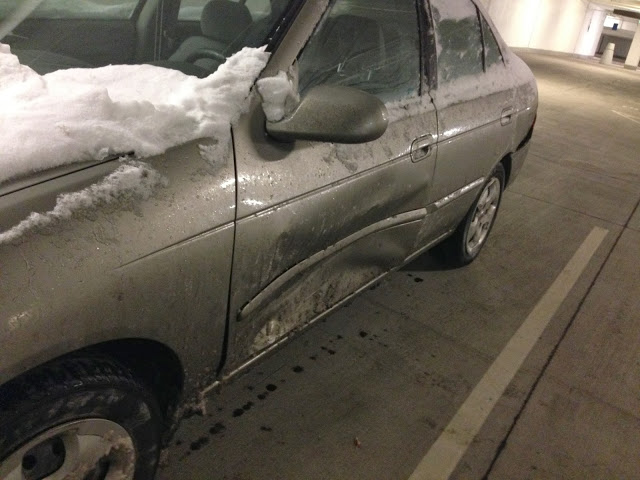 | I walked out to my parked car on Sunday to find that it was completely smashed up in several places. Fortunately homegirl left a note. |