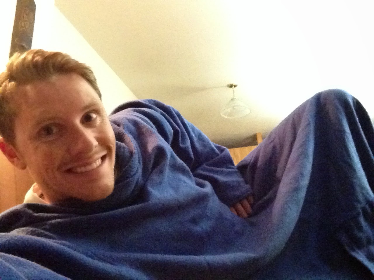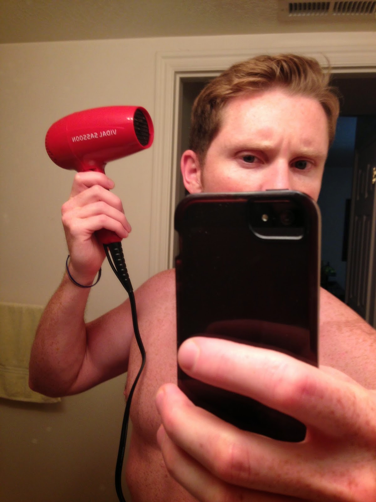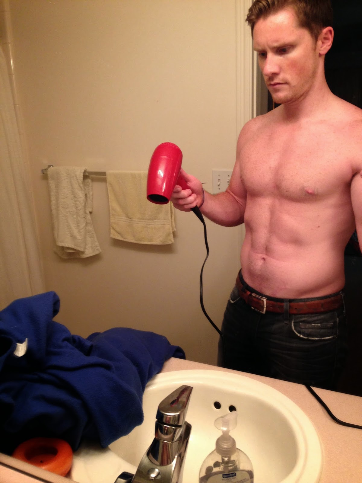 | Blow drying the Snuggie. Pretending not to be flexing. |