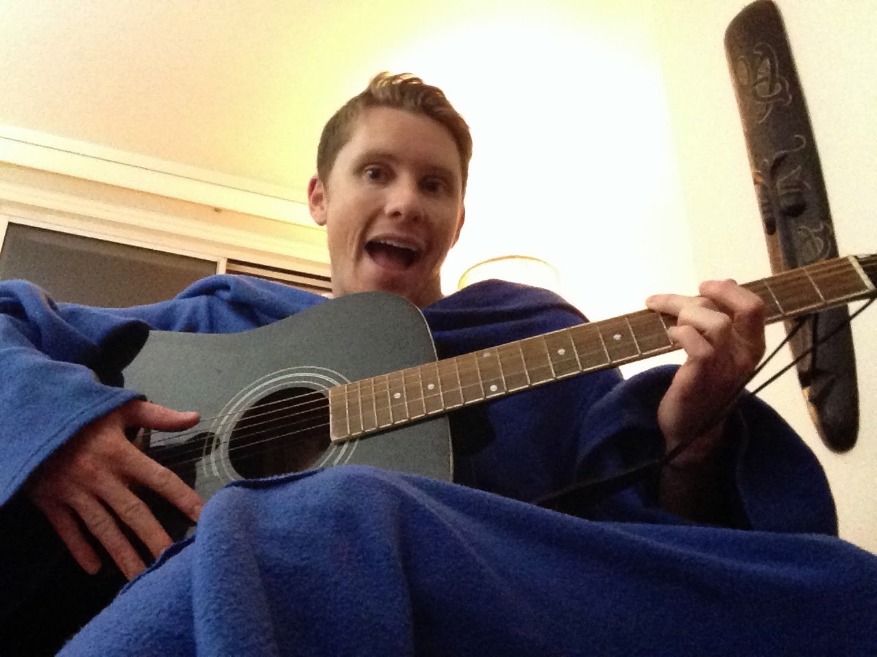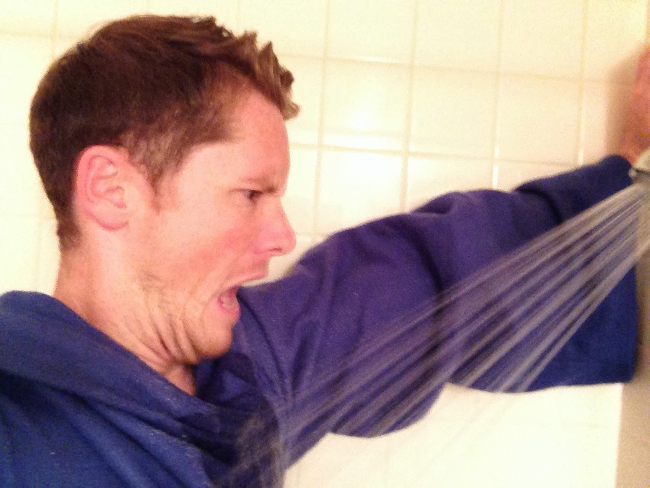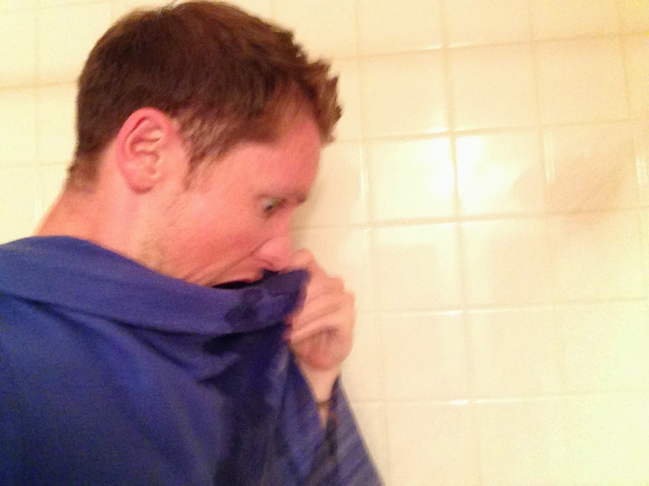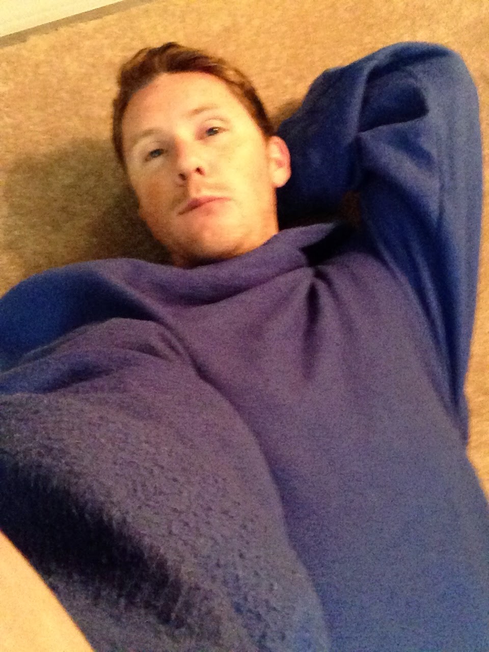 | Blow drying the Snuggie. Pretending not to be flexing. |