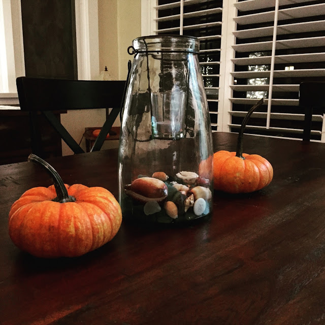 | Two pumpkins nestled between some Palauan seashells. The diversity of my dining room is so huge you can see it from space. |