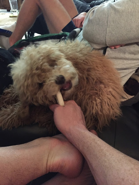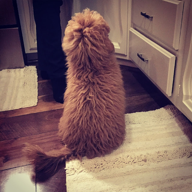 | I couldn't get Mr. Scraps to be interested in Survivor once he found Mr. Pants's bone. Also, Wade is showing a lot of leg in the background. |