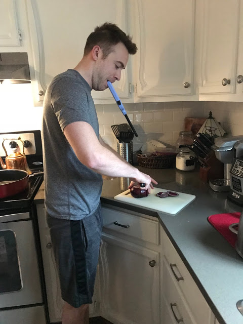 Skylar was dicing onions and I didn't have matches so he put a lighter in his mouth and I don't even know.