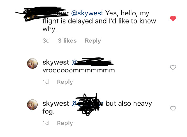 Because people think Skylar is the airline, pretty regularly he gets tagged in posts from people complaining about flight delays, poor customer service, or just including pictures of airplanes and thanking SkyWest for making their upcoming trip possible.