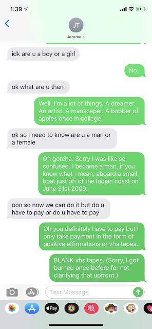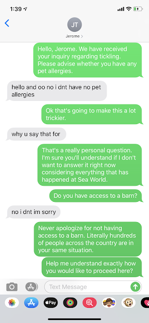 I can only assume this person emailed me specifically because he stumbled upon an old post where I exchanged emails with someone who wanted to pay me for some exchange of tickling. Presumably Jerome, whose reading comprehension is, all evidence suggests, not great, googled some string of words our mothers don't even know we know, landed on Stranger, found my email, and thought he'd give a go.