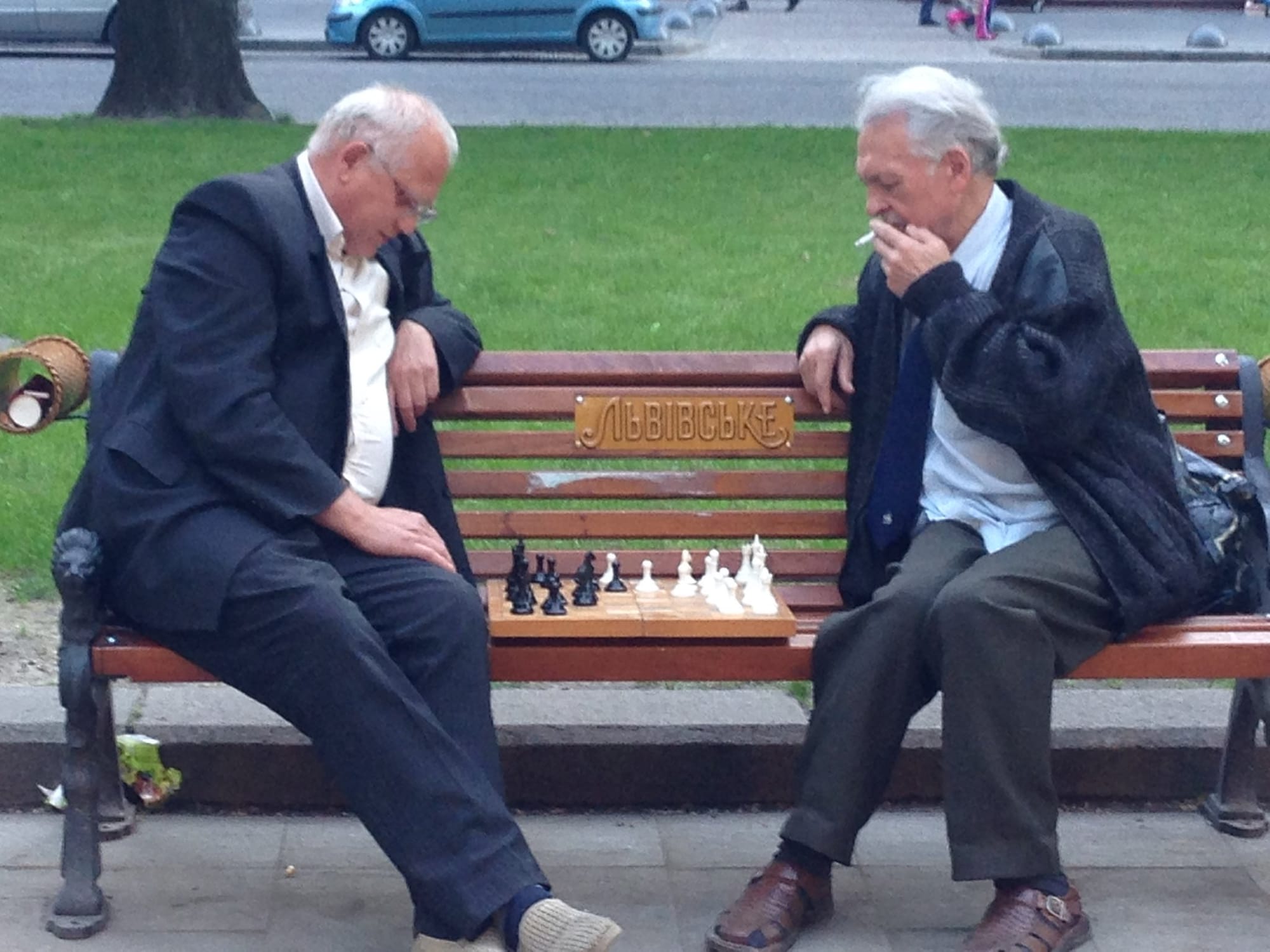Benches run down both sides of the plaza. Nearly every bench is headquarters for its own game of timed chess between two elderly men. A crowd of their peers, spectators, stand around each duel, their hands behind their backs, leaning down to get a better look at the action as they backseat drive every game. The men are all wearing hats and polyester coats—the same ones they probably wore forty years ago. Arguments break out from time to time in these groups. The arguments are about politics and history and the molasses-like changes in the city that probably feel abrupt to this particular crowd that defines change as abrupt. The arguments never seem to be about the chess game. If you stand near one of these groups long enough you can usually hear at least one person shout the name “Taras Shevchenko.”
