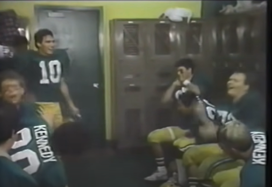The football players (there are apparently only like 8 people on this entire team) then enter a tiny locker room where they awkwardly high five each other and scream for several seconds before they politely, and in unison, take their seats on two benches facing one another.