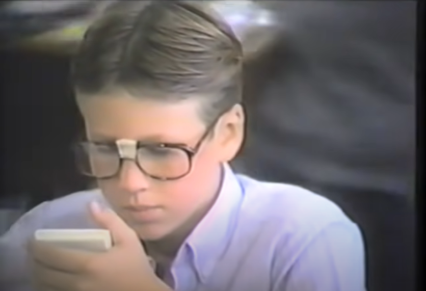 An absolute dweeb is shown with taped glasses and he is using his calculator in the school cafeteria. NERD!