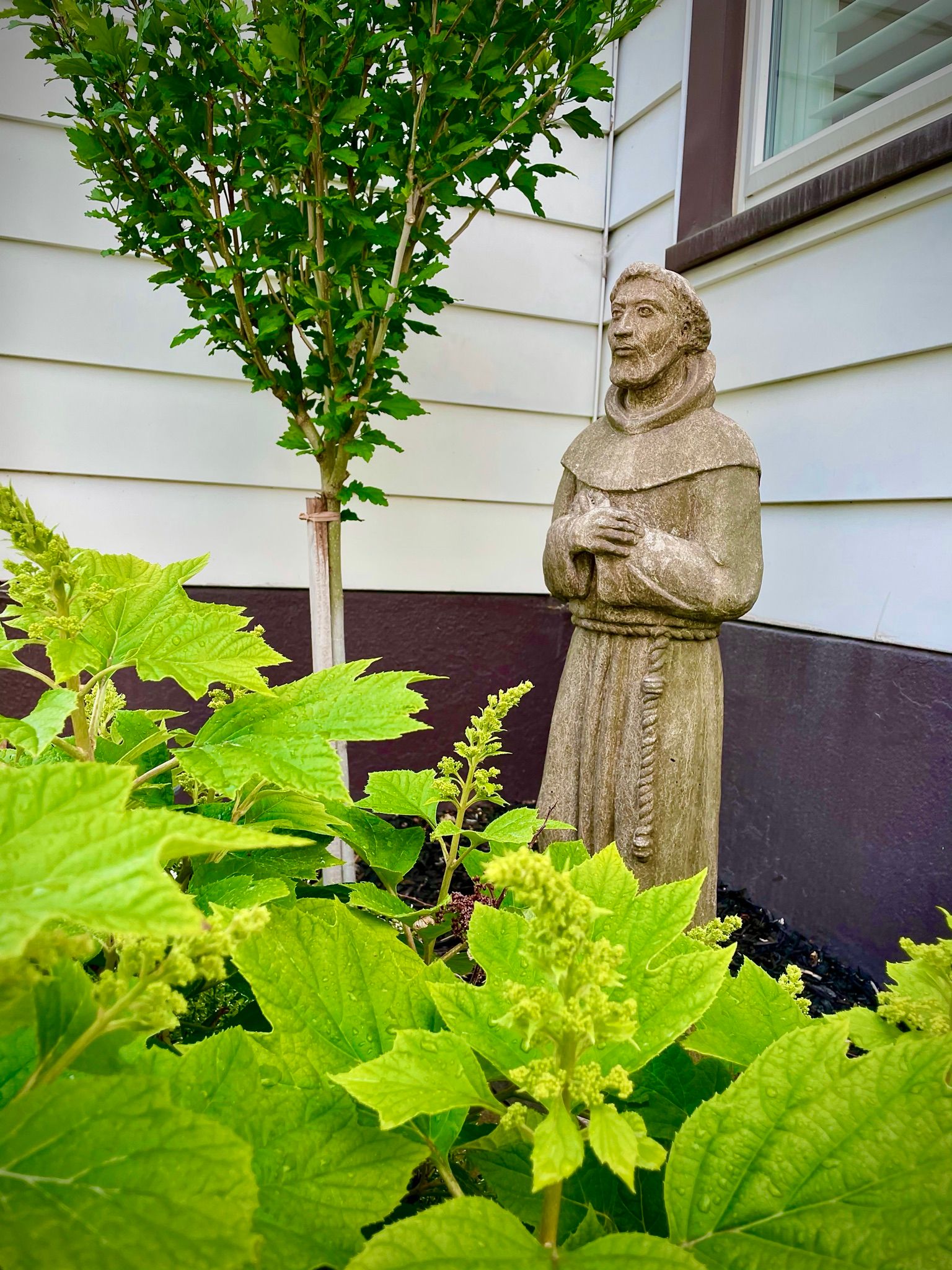 We pulled up to the house a few minutes later and before I could even unload my bags from the car I found myself carrying a 200 pound stone bench, a statue of a St. Francis of Assisi, several large standing pots, and half a dozen chipped wall hangings from Lynne's yard to ours.