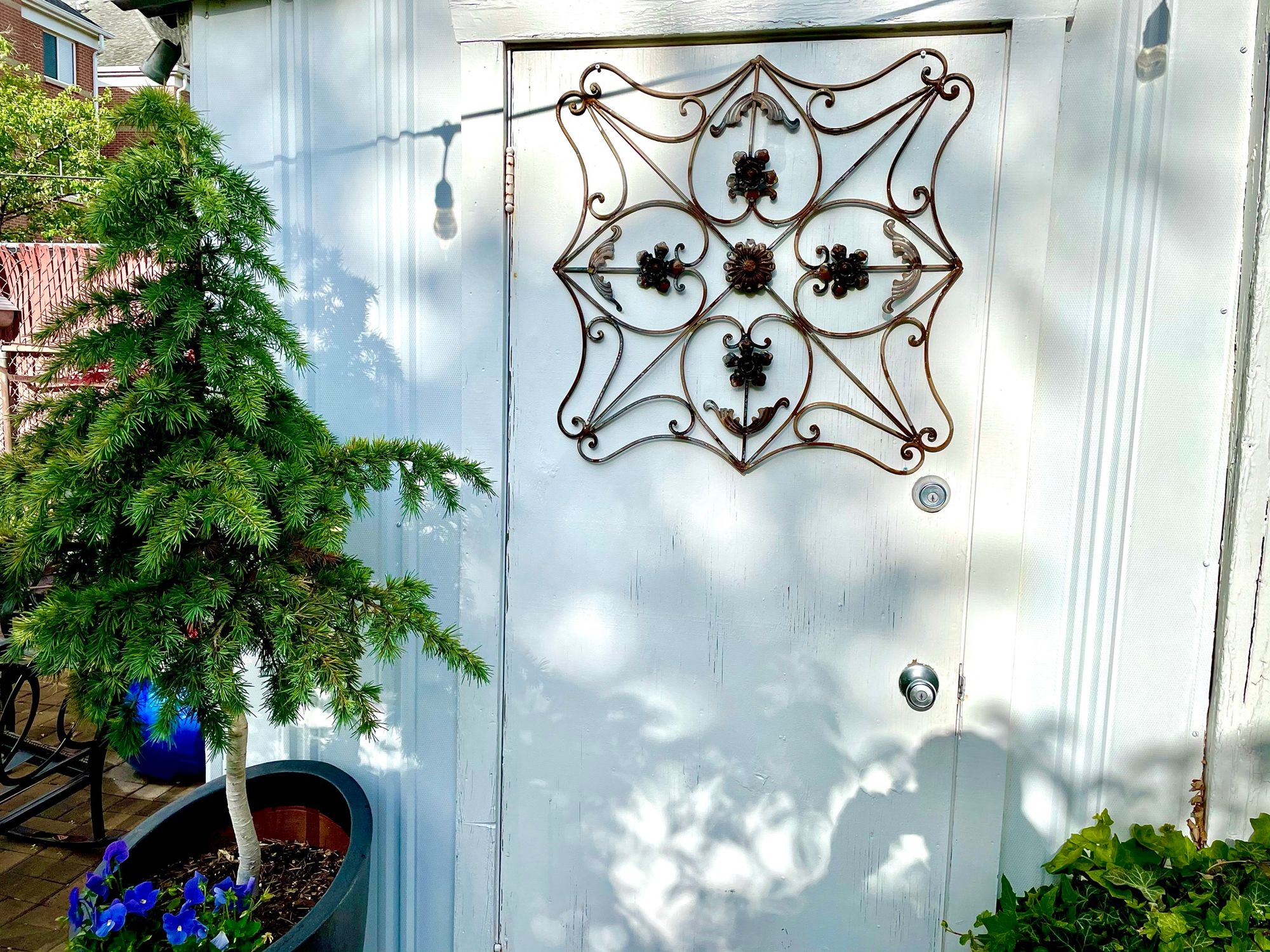 We placed the new pieces, nestled among our own lilac bushes and tulips. We hung the art on shed doors and bricked walls. We planted the pots and scattered them about.